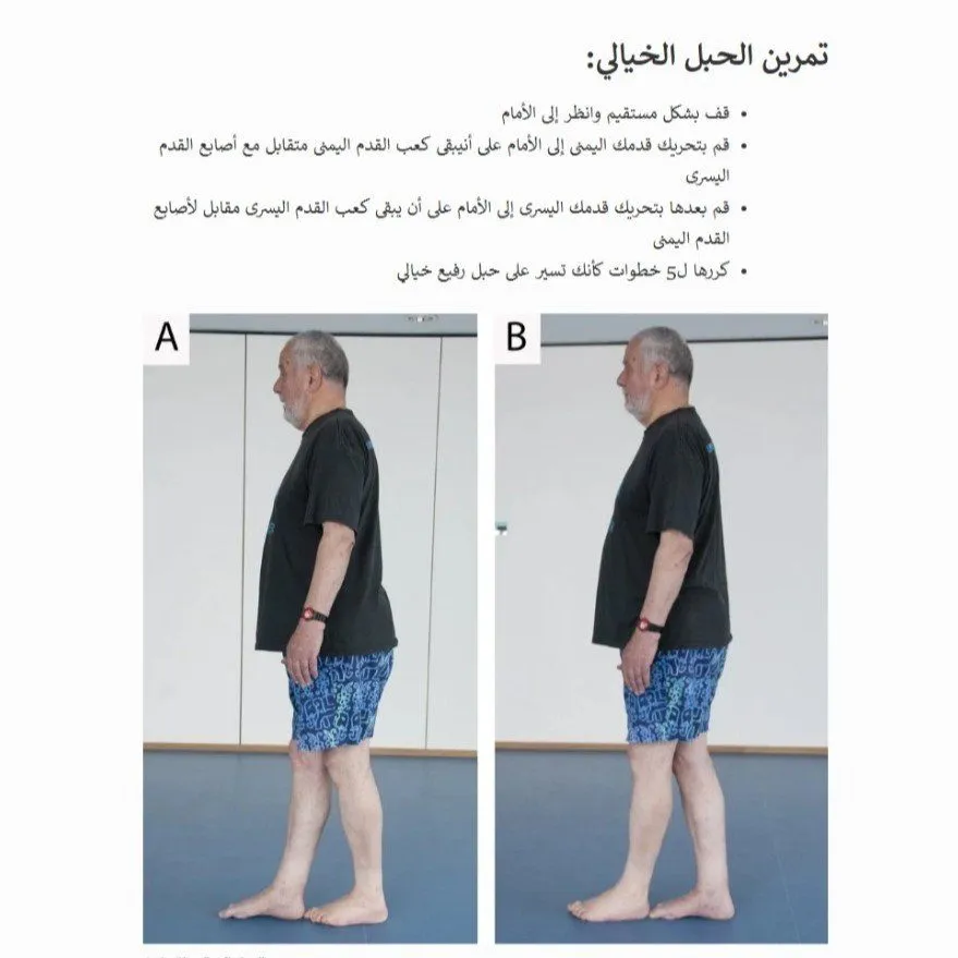 - المشي على خط مستقيم (Heel-to-Toe Walk): المشي بوضع كعب القدم أمام أصابع القدم الأخرى مباشرة، كما لو كنت تمشي على حبل مشدود.