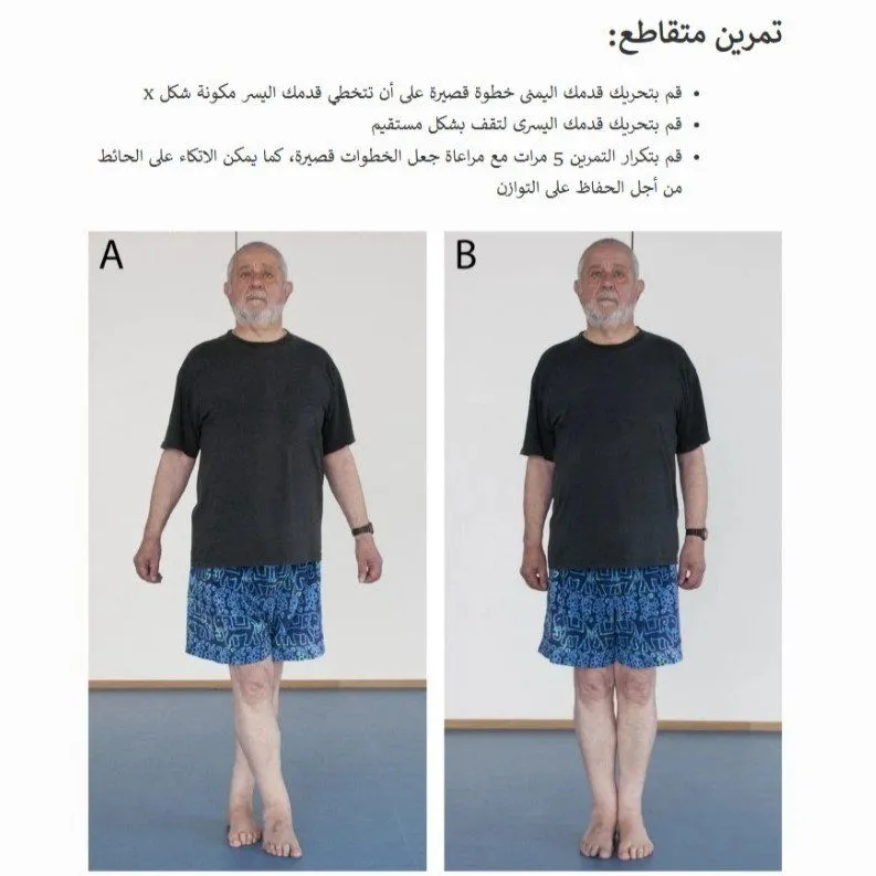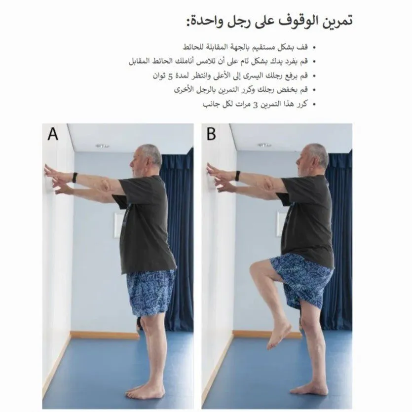 أمثلة لتمارين التوازن (يجب ممارستها بالقرب من جدار أو كرسي ثابت)