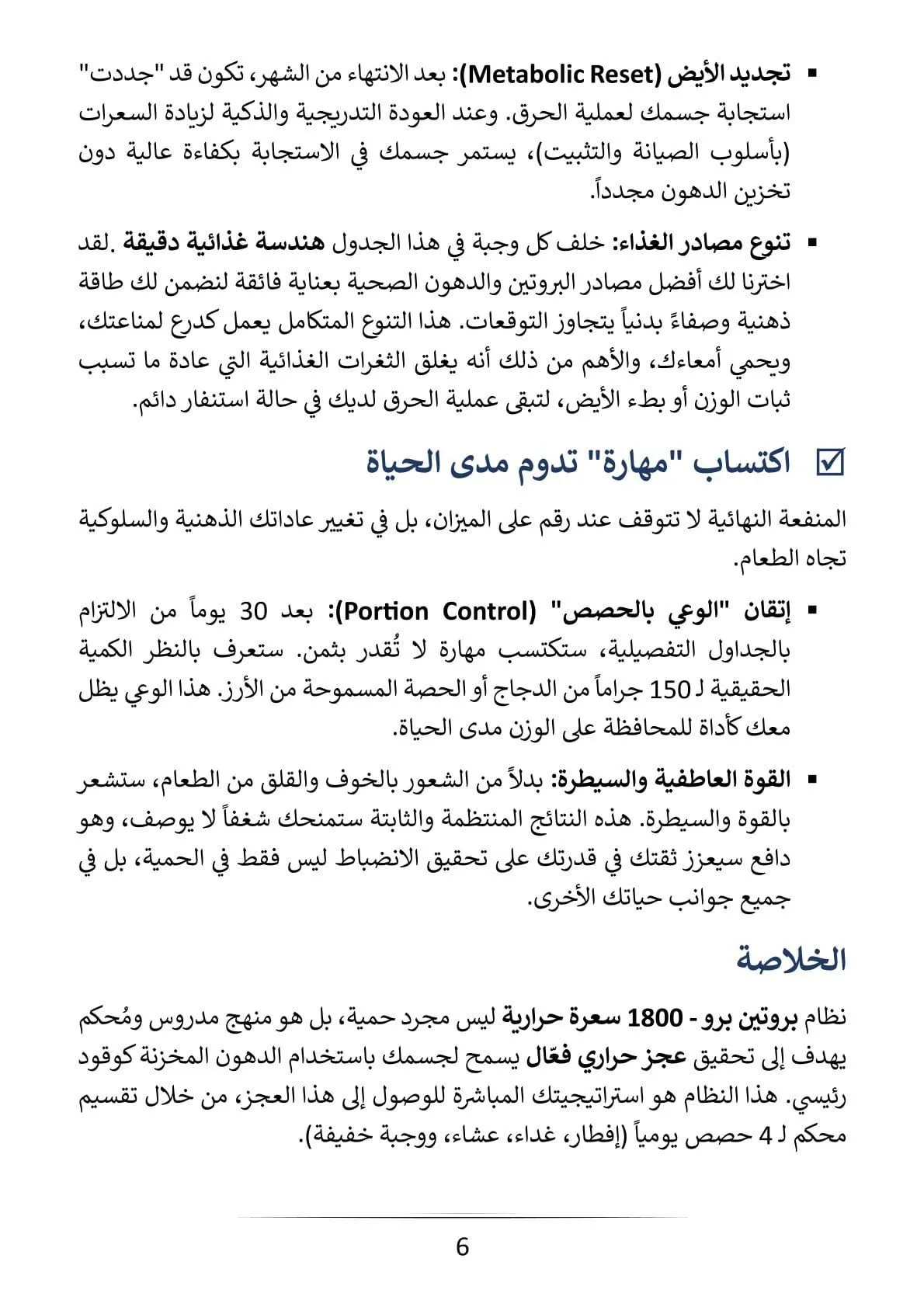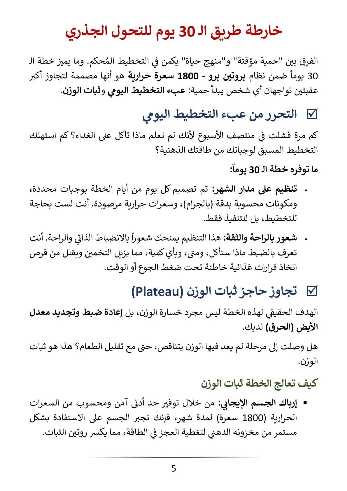 - وداعاً لحيرة التخطيط: جدول كامل لمدة 30 يوماً، يحدد لك الوجبات والمكونات بالجرام بدقة متناهية. أنت لا تخطط، أنت تنفذ فقط.