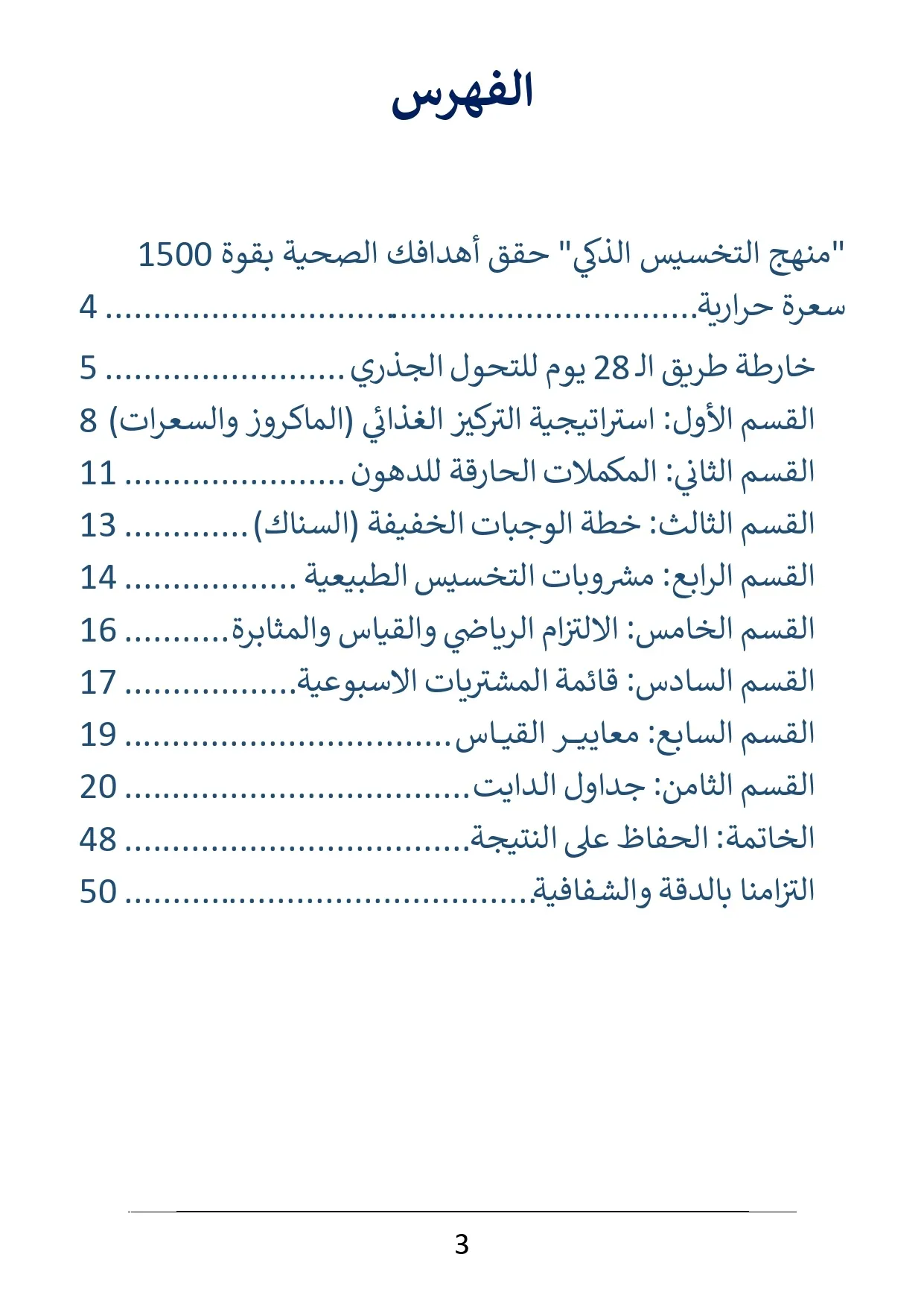 - وداعاً لحيرة التخطيط: جدول كامل لمدة 30 يوماً، يحدد لك الوجبات والمكونات بالجرام بدقة متناهية. أنت لا تخطط، أنت تنفذ فقط.
