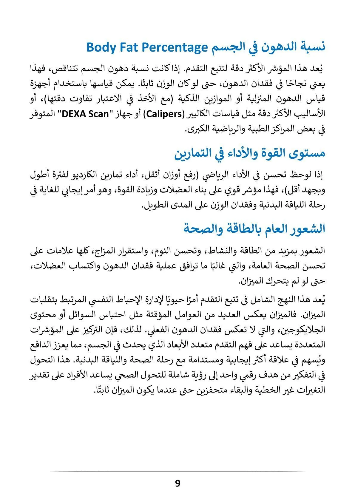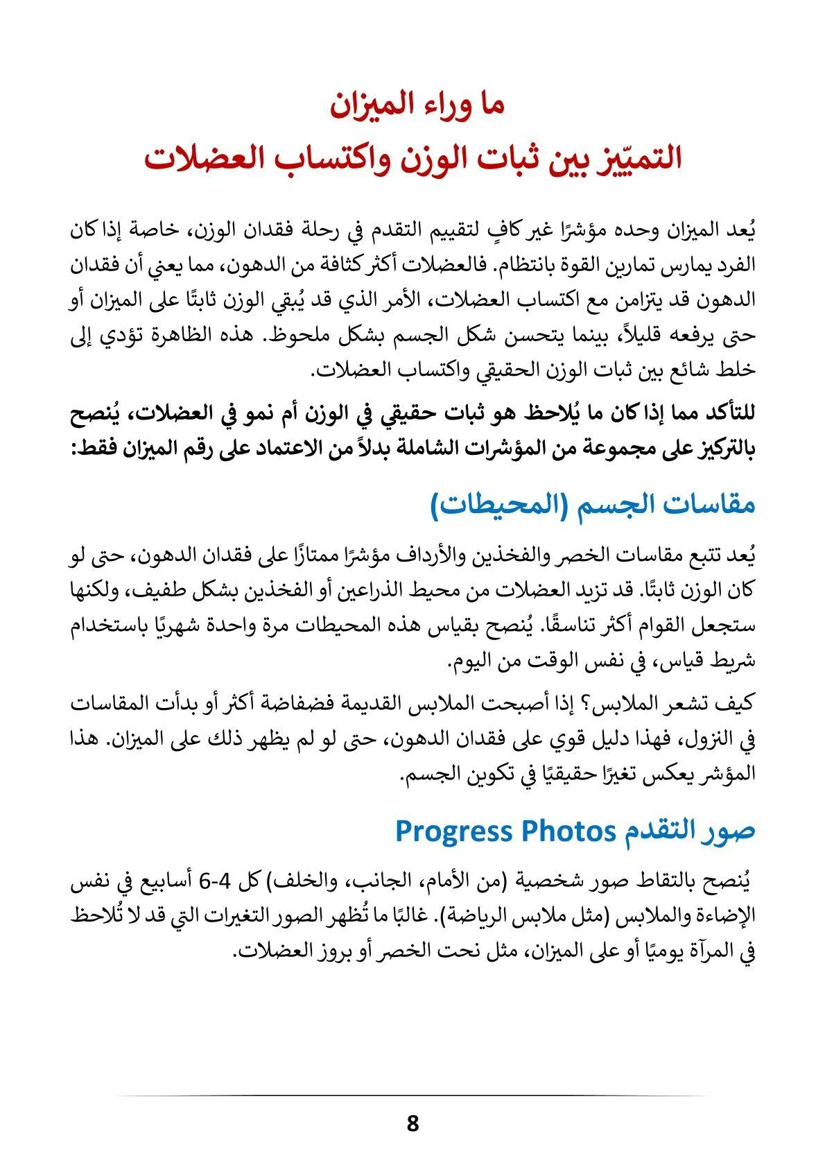 - التتبع الشامل للتقدمBeyond the scale: تعلم كيفية قياس التقدم الحقيقي من خلال مقاسات الجسم، وصور التقدم، ونسبة الدهون في الجسم، ومستوى القوة والأداء، والشعور العام بالطاقة، بدلاً من الاعتماد على رقم الميزان فقط